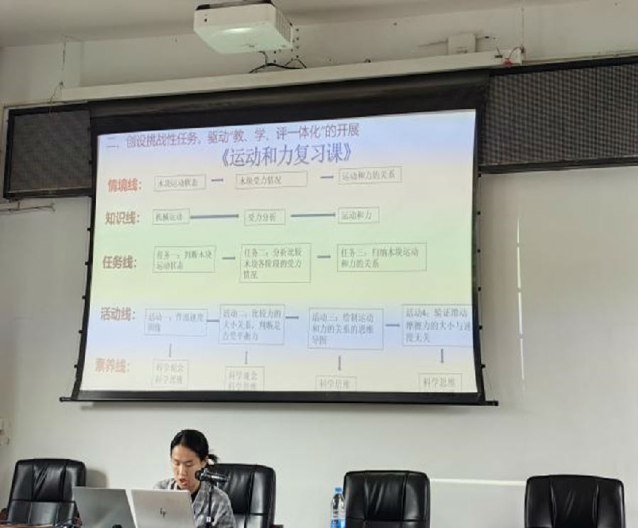 来自温州市第八中学胡玥秀老师带来主题分享《重视探究实践 落实教学评一致性》,她指出完整的教学活动分为教、学、评三个方面。她从教学目标到评价目标再到学习目标评价了林冬冬老师的《运动和力》这堂复习课。与此同时,她从情境、知识、任务、活动和素养五条线,提出通过问题提供支架,重视探究实践,设计持续性评价才能落实教学评一体化的观点。