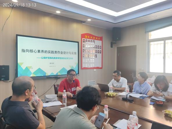 龙湾中学姜海瑞老师以“指向核心素养的实践类作业设计与实施——以保护滨海鸟类多样性项目化学习为例”进行了分享,详细阐述了如何研读课程标准、结合社会热点议题、设计学习目标和问题推进学习等步骤。
