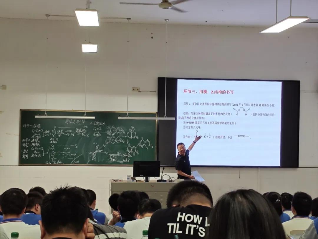 工作室主持人瑞安中学徐克老师带来了题为《母体组装法——复杂限定条件下的同分异构体的书写》。徐克老师提出了利用“探模”、“建模”、“用模”三步,实现对浙江省高中化学选考试题中的有机化合物同分异构体书写进行拆解分析和解答。