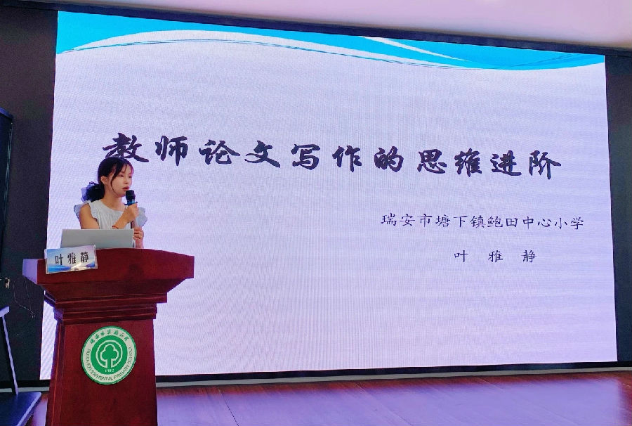 活动的第一个环节是由两位学员带来经验分享。第一位分享的学员是来自瑞安市塘下镇鲍田中心小学的叶雅静老师。她以《教师论文写作的思维进阶》作为分享的主题。叶老师在论写写作的过程中,结合自己的生活经验,将教师的论文写作比作买房装修,结合获奖的论文分别从立意选题(选址)、谋篇布局(建房)、充实内容(装修)和推敲修改(修改)的四个方面梳理自己的论文写作中的所思所感。叶老师还特别强调,教师在平时的教育教学中应多阅读,勤动笔,善积累,在坚持和等待中静待成长。
