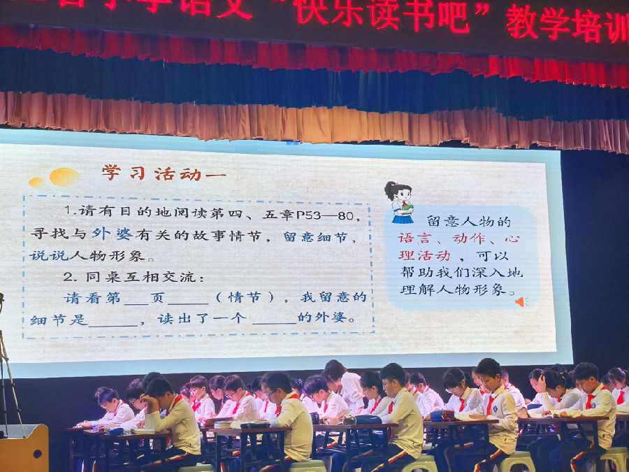第二节是叶金花老师带来的《童年》推进课。叶老师围绕“外婆”这个典型人物形象,通过寻找书中“外婆”的语言、动作、心理描写,学生深入其境进行模仿,感受时代对女性的压迫。接着,叶老师设置“人物形象卡”环节,学生对书中的人物形象有了具象的感受。最后,出示学生阅读时的困惑引导学生交流阅读方法,激励孩子带着问题继续读《童年》。