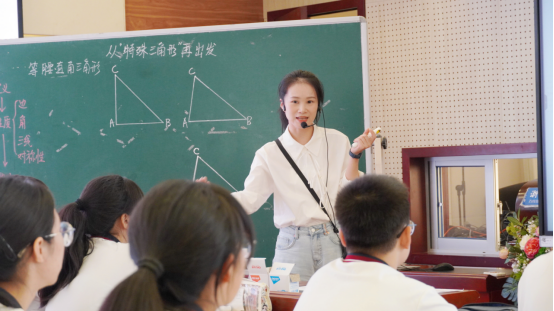 来自温州市第八中学的张铭洁老师带来了课题为《从“特殊三角形”再出发》的精彩课程。本节课回归三角形研究的知识框架,以等腰直角三角形为载体,让学生基于等腰三角形与直角三角形展开研究,感受等腰三角形与直角三角形在图形研究中的应用。随后,从熟悉的含特殊角度的直角三角形一般化到倍角三角形的性质讨论,巧妙地渗透和强化了从一般到特殊,从特殊到一般的数学思想。