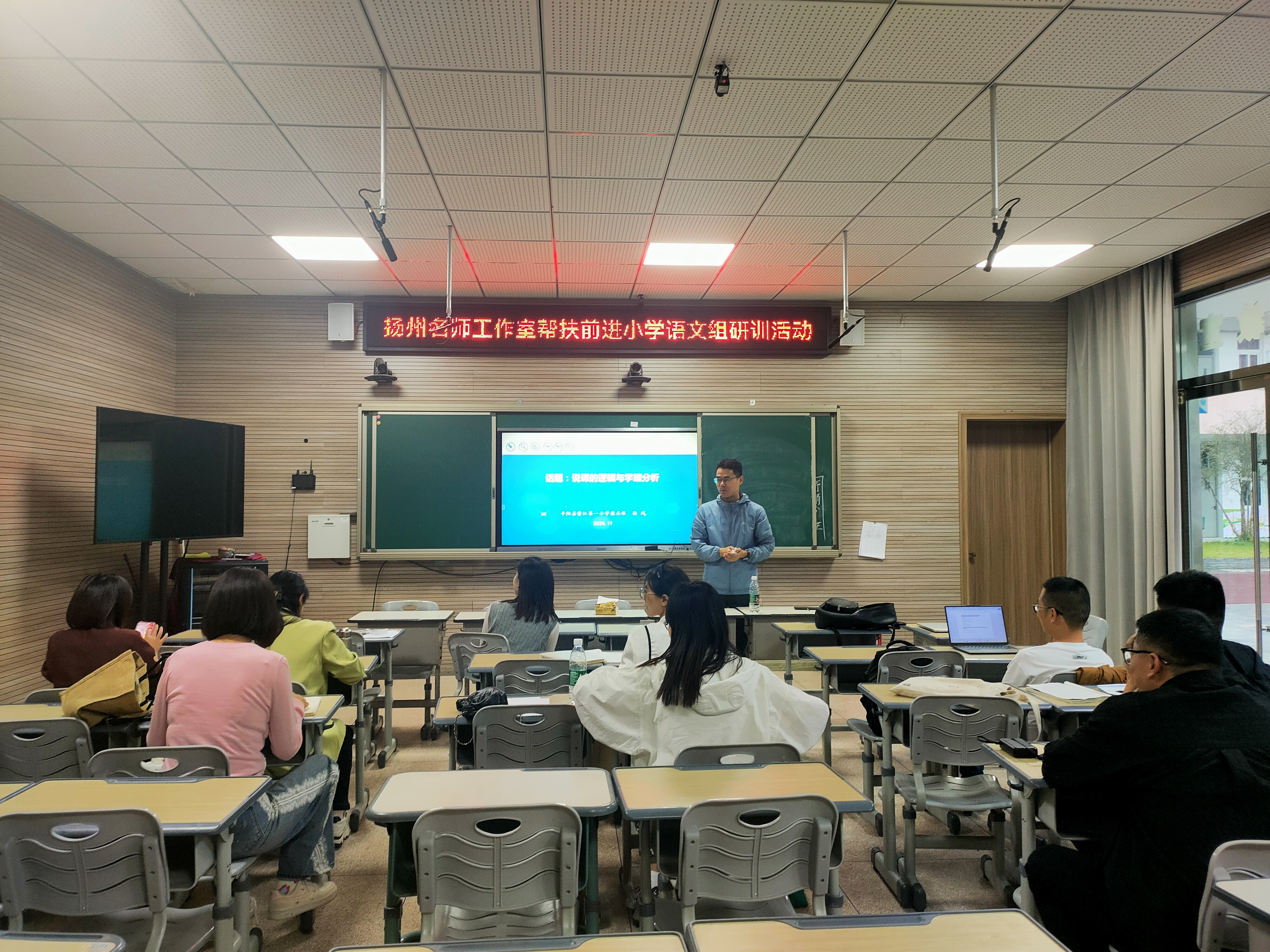 秋意渐浓初冬至,暖阳融融教研时。11月9日,温州市杨州名师工作室来到平阳县鳌江镇前进小学,开展帮扶语文组的研训活动,名师工作室主持人杨州、鳌江镇前进小学校长陈建成及来自各县市区的学员参加活动。
