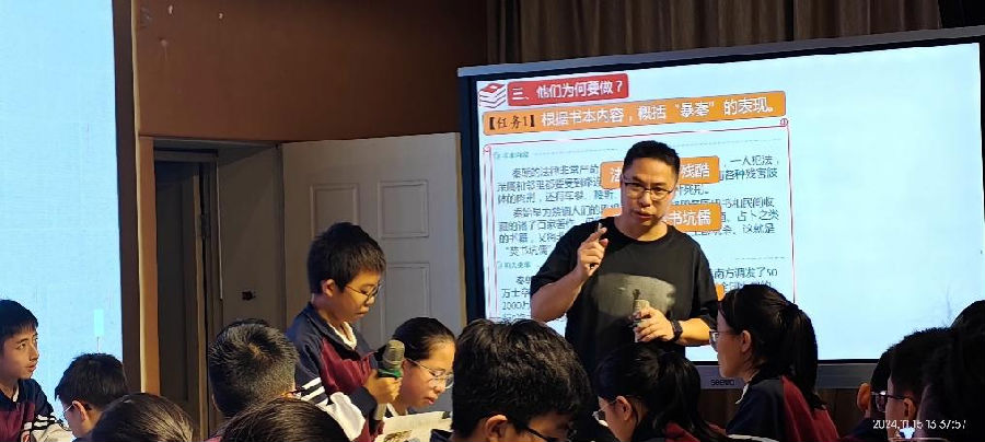 活动的第一项议程是李启建老师带来的《秦末农民大起义》。李老师以教材中“陈胜吴广起义”历史图片插图为主情境,组织学生讨论引出“他们是什么人?他们要做什么?他们为何要做?他们成功了吗?”这四个主问题,然后引导学生阅读教材内的文字资料、地图资料和教材外的《史记》文献资料,在起义过程的史实梳理中培养时空观念和史料实证素养,在秦暴政的原因分析中引导学生阅读书本获取信息的能力和历史解释的素养;在起义是否成功的辩证分析中渗透“人民才是创造世界历史的动力”唯物史观和家国情怀提升了课堂高度。