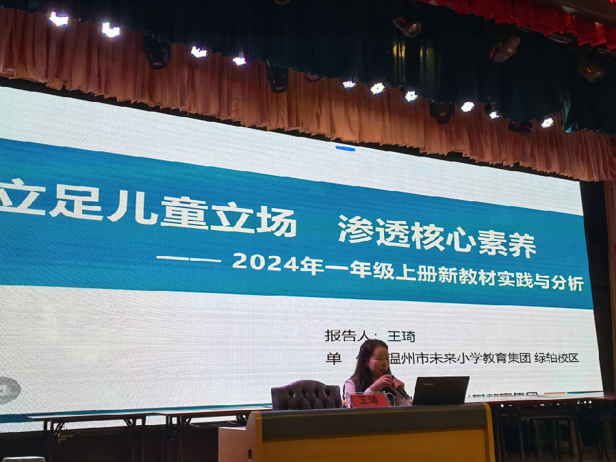 第二项活动,由温州市未来小学教育集团绿轴校区王琦老师作《立足儿童立场 渗透核心素养——2024年一年级上册新教材实践与分析》讲座。王老师以课标的变化方向为指导,深入剖析新教材的核心素养要求。在新旧教材的对比中,解读新教材的特点并提出新教材的变化:单元编排更有结构化,注重知识连续性;幼小衔接更具操作性,重视综合与实践;更注重数学本质的探究;情境更贴近儿童和现实;解决问题更关注过程的思考;学习方式、评价的革新升级等。同时结合自身的教学实践与思考,提出切实可行的教学建议,得到与会老师与专家的高度肯定。