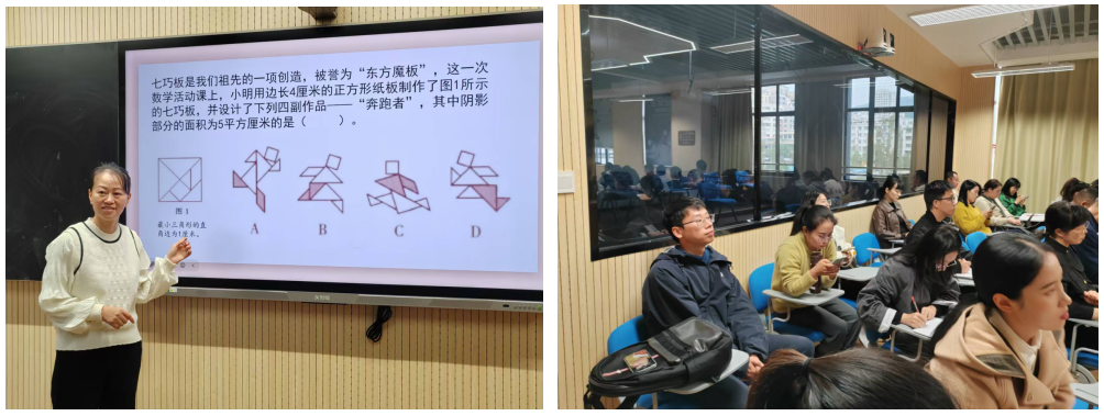 第一节是由李微珍老师和五年级孩子带来的《奇妙七巧板》,以传统七巧板为切入点,通过探究点、线、面让学生体验直角等腰三角形,尤其是45°角的神奇之处,感知七巧板七块板之间的面积比,并以此来灵活解决问题。