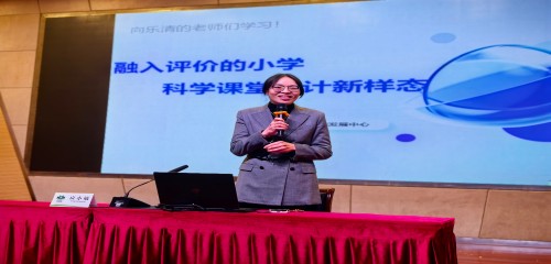 最后,活动的重头戏有平阳县教师发展中心、省特级教师应小敏做专题讲座《融入评价的小学科学课堂设计新样态》,此次讲座围绕融入评价的小学科学课堂设计,应老师从素养本位导入,素养本位课程是让学生日复一日的课堂上做事、创造和解决问题的课程。而表现性评价是素养本位课程的主要评价方式。在教学过程中如何融入评价的三个问题:搞清楚学习者的学习状况;确定他们要去哪里;决定如何到达哪里?通过详细的课例分析介绍了评价如何设计、融入、实施,以促进学生素养的发展和素养本位的教学发生。应老师的讲座深入浅出、条理清晰,让与会的教师受益匪浅。