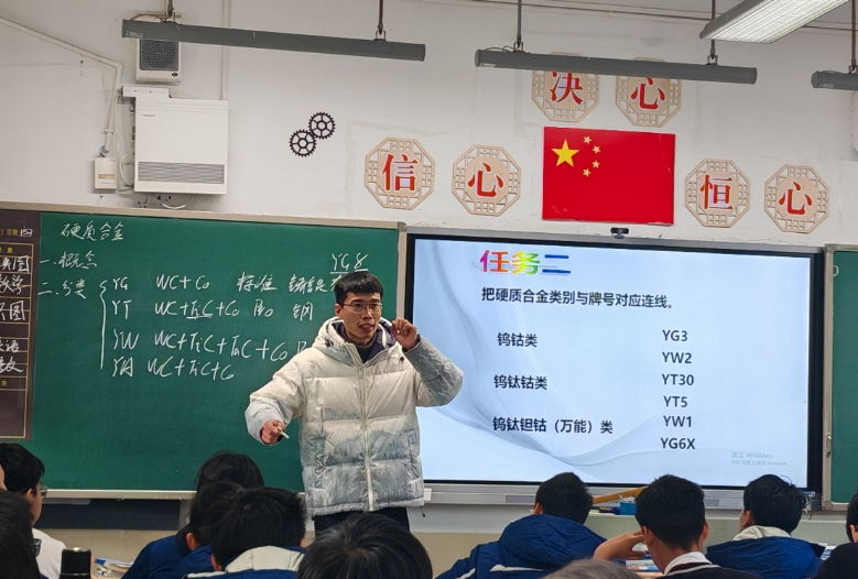 乐清市虹桥职业技术学校的郑新富老师带来《认识硬质合金》复习课,郑老师通过自己配音的微视频引导学生了解硬质合金的特性对应用的影响,课上重点引导学生自己梳理不同种类硬质合金的特性和应用,培养学生自主学习的能力。通过专项课堂练习让学生对硬质合金的加工应用范围有了更清晰的认识,巩固所学知识点。