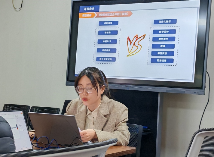 永嘉县职业中学的杨仙和老师,结合自身参赛经历,作《聚焦真问题 探寻真举措--“多彩课堂“教学实例分析与启示》经验分享。杨老师分享了课题的由来,结合自己参加省信息化说课感悟、梳理多彩课堂《绘制支架组合体的三视图》的申报表、申报ppt、申报视频的注意要点,针对问题及设计理念、改革举措、创新点、实施成效给出宝贵的建议。