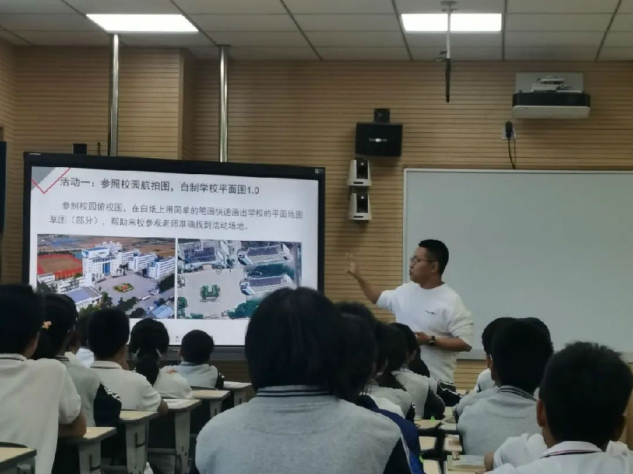 第一节由王格老师带来七年级上册第三章第一节《认识地球(三)——绘制校园平面图》的教学展示。王老师以“到虹桥一中却找不到综合楼”,来引出本节课的核心任务:绘制校园平面图。通过3个大活动,由1.0版的草图,到2.0版的标准图,再到3.0版的具有精准、更多功能的电子地图的流程方式。由简单到复杂,不断迭代升级,在这些过程中,落实了本节课的教学目标,发展了学生的科学思维。