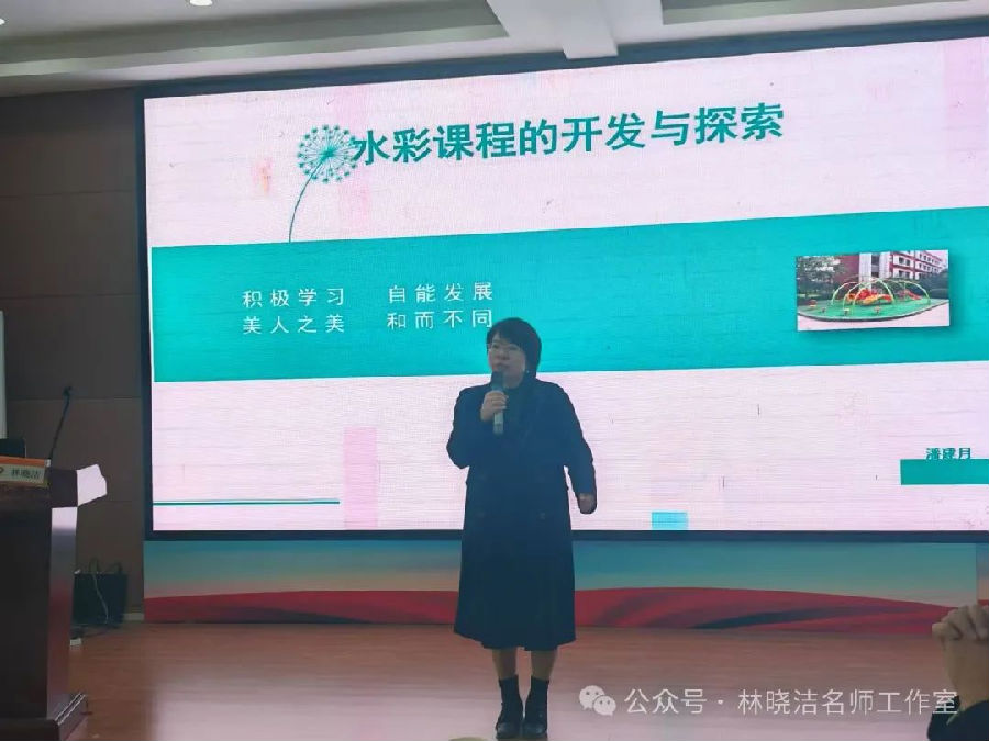 最后,潘建月老师分享关于《水彩课程的开发与实践》,分析了在当前美术教育领域中对水彩课程教学的需求,通过具体的教学案例,探讨水彩课程的创新与发展方向,展现了水彩画的教学实践过程,让与会老师深刻感受到了水彩画教学的重要性和挑战性。
