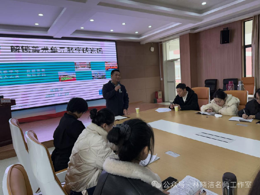 林晓洁老师为我们带来专题讲座《解锁美术单元教学的密码》。通过为什么进行单元设计、何为单元设计以及如何进行单元教学三个方面进行解读分享。绘画是老师与学生之间交流的工具,也是学生认知的传递,教师要通过美术教育手段激发学生的创造力。接着,林老师分析核心素养下教材设计的逻辑,以赣美版教材举例,从大任务的视角认识大情景,知其然,知其所以然。让与会老师对美术教育的理念与方法有了更深入的理解,为今后的教学工作奠定坚实的基础。