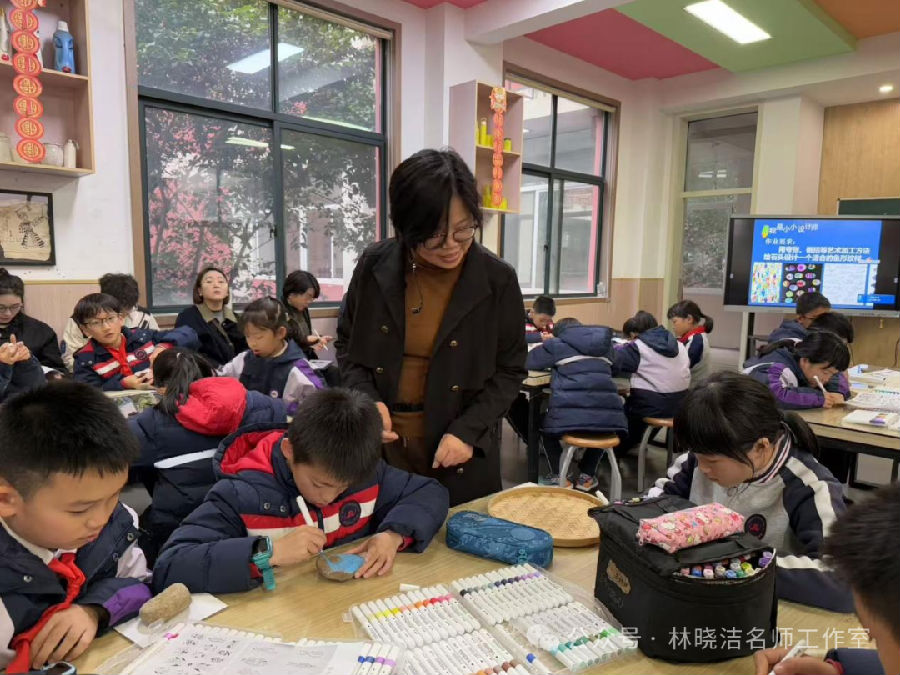 首先,林晓洁老师带来四年级课例展示——《鱼纹鱼趣》。用“鱼”的字形来导入课程,引导学生去思考关于“鱼”的美好词汇,激起学生的学习兴趣与探索欲,将美术融入于生活之中。接着以学习任务单为驱动,学生通过了解不同时期鱼纹的样式,感知传统图案的文化内涵与象征意义,掌握点、线、面的技法运用,以鹅卵石为媒介,创作出一幅幅充满童趣和美好寓意的作品。取之自然又用于自然。
