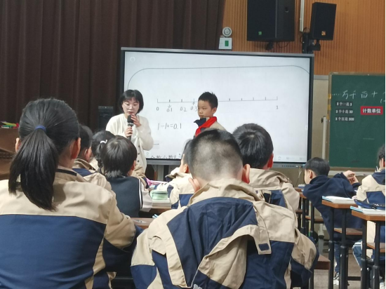 第二节课由温州市鞋都第一小学的金纯纯老师带来研讨课《小数的意义》。金老师从一条平均分成10份的线段引入,引出计数单位,并以“有比一更小的计数单位吗”来展开讨论,引出对小数计数单位的活动探究。金老师让学生在线段中分一分、画一画让学生理解把1平均分成10份,每份所得的计数单位是0.1,而进一步感悟十进制计数法,并在数一数中感受0.3就是3个0.1的累加,发展学生的数感。随后再以探究0.33得到把1平均分成100份,每份所得的计数单位是0.01,层层递进,深度剖析,理解小数的意义,感悟数概念的本质,并关注了整数、分数、小数等知识之间的联系。