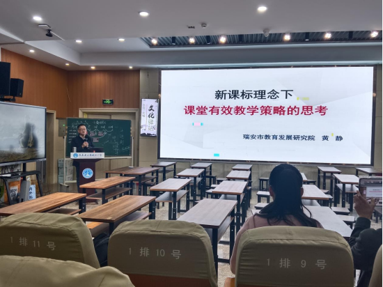11月30日上午,精彩继续呈现,瑞安市教育发展研究所特级教师黄静老师带来了《新课标理念下有效课堂教学策略的思考》精彩讲座。黄老师以“好素材:学习的发送机”、“好问题:思考的助推器”、“好互动:过程的润滑剂”三方面展开讲述,并结合具体的课例展开详细的讲解与分享。黄老师强调课堂应从学生需要的地方开始,在生活与数学之间趣味相连,在知识和方法之间巧妙呼应,在文本和学生之间多元链接,要在一节课的本质处“点上打井”,提出好的问题,最后黄老师提到教学要做到有需的学习——有序的关联——有序的生长。