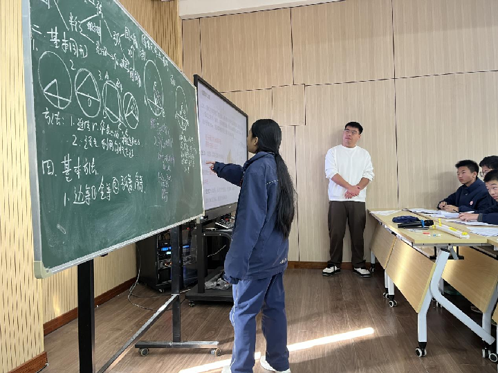 第一节由乐清市清江镇中学的方文阳老师执教。首先,方老师对作业的情况进行数据分析,展示得分率较低的几道题,从错误率较高但难度较小的作图题出发,引导学生用弦的中垂线找到圆心,解决生活中的破镜重圆问题。接着,通过学生自己诊断错因,在老师的引导下总结证明边等的基本方法、基本图形。为后面解决难题作准备,轮船吃水深度的求解以及变式问题,课堂中师生思维的碰撞达到高潮。通过这堂课,学生不仅巩固了圆的知识,也学会了如何对待自己的错题!特别是邀请错题本人到黑板上进行剖析,既有效地分析错因,又让课堂丰富多彩、充满活力。