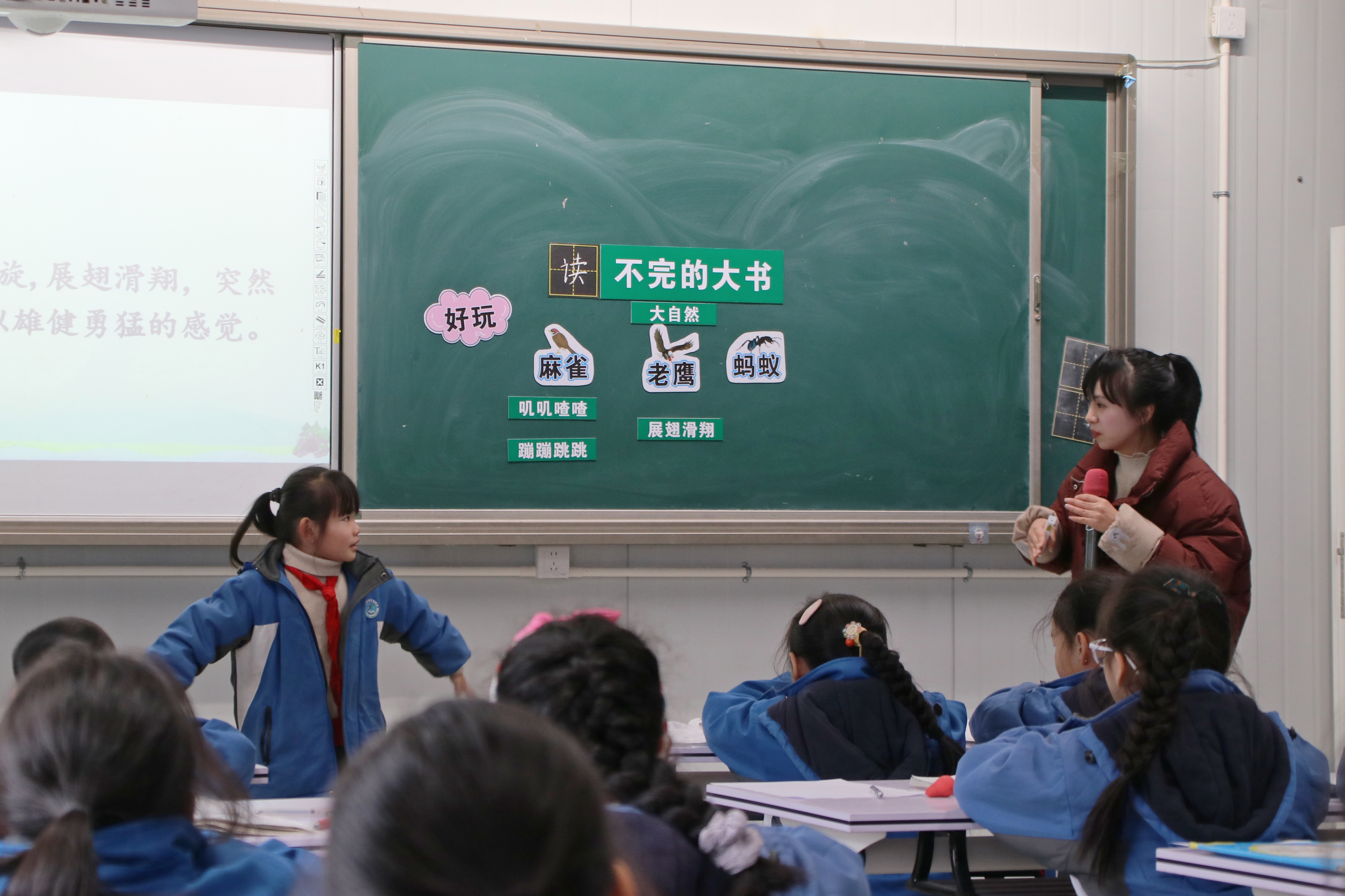 首先进行的是三节教学研讨课。第一节课由苍南县新安二小陈冬冬老师领着三年(1)班孩子们走进了趣味横生的大自然,品读了《读不完的大书》。一张张鲜活的图片,一次次入情的朗读,孩子们在多彩的想象里,构建了一个读不完的自然世界,最后抒写下自己生活中观察到的动物朋友们,与作者一同续写这本《读不完的大书》。