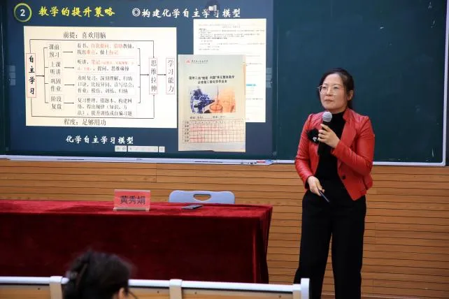 温州二高正高级教师黄秀娟老师作了《脑科学赋能化学课堂教学》的专题讲座。黄老师分享了三脑理论、四种重要快乐递质的脑科学基础知识,提出了化学课堂提升的策略:首先要构建化学自主学习模型,其次要开展基于情境--问题双轮驱动的教学模式,最后要建立教学评的正面反馈。