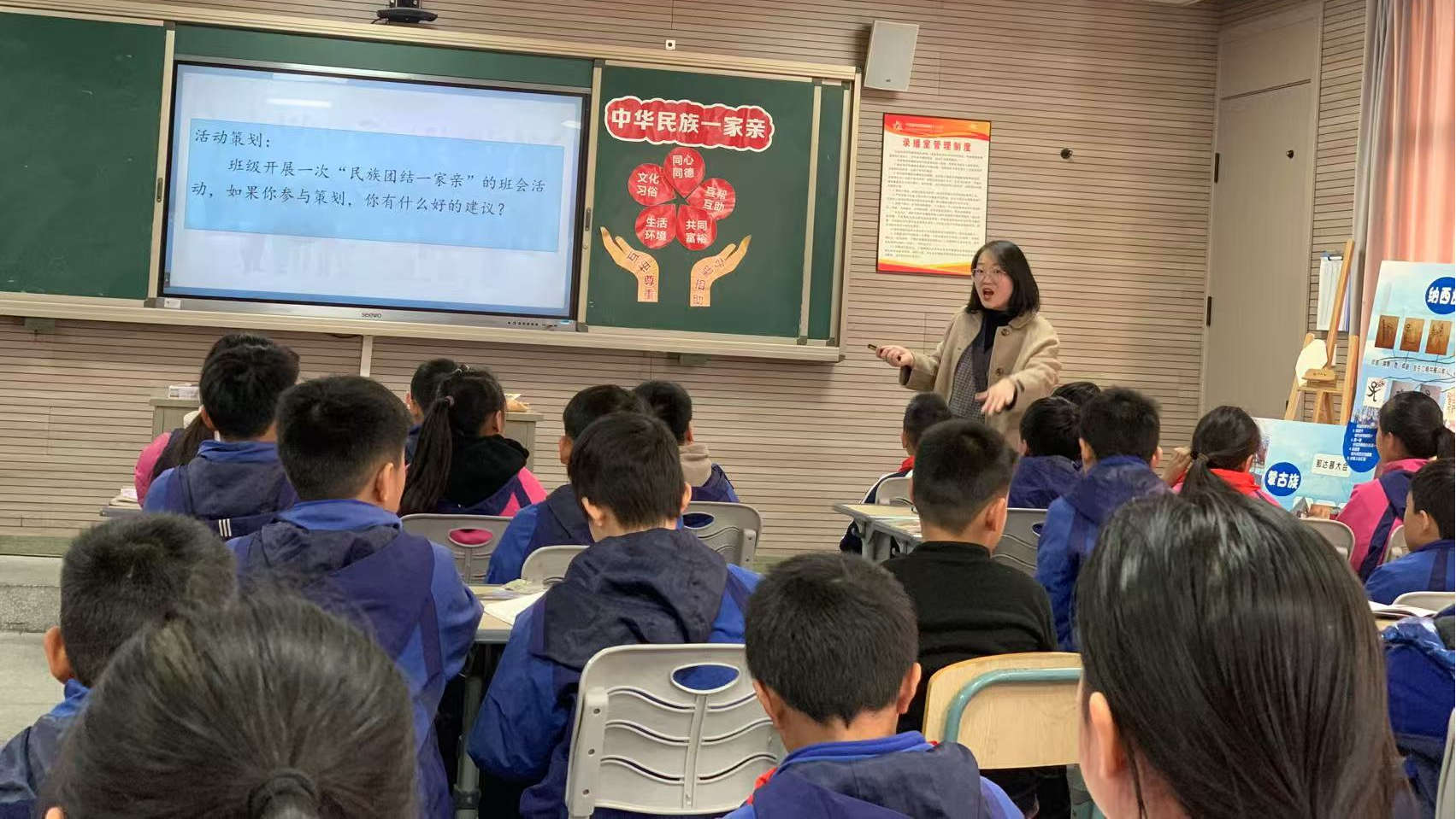 第一节课是由平阳县昆阳镇实验小学雷素秋老师和五年(1)班同学合作带来的课例展示《中华民族一家亲》,雷老师在课堂上引入了畲族女孩“雷娜”这一学习伙伴,通过“猜一猜民族”“介绍民族特色”“说说和少数民族朋友的故事”三个板块,让学生们在活动中了解各个民族的特色,尊重各个民族的习俗,感受“中华民族一家亲”的深厚情谊,从而进一步地落实核心素养。