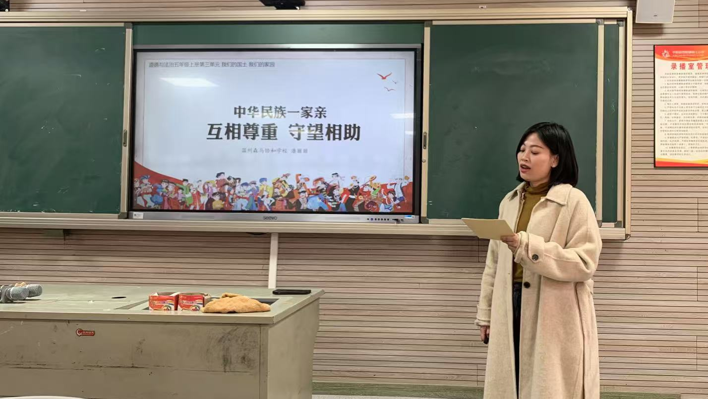 紧接着是由温州森马协和学校的潘丽丽老师带来的说课展示《中华民族一家亲》,潘老师依据课前调查,制定学习目标,以驱动性任务:制作“中华民族一家亲”主题期刊,并设计了三个学习活动,结合《习读本》,让学生充分了解到各个民族的特色,树立中华民族共同体的意识,增加学生们的认同感,让核心素养内化于心,外化于行。