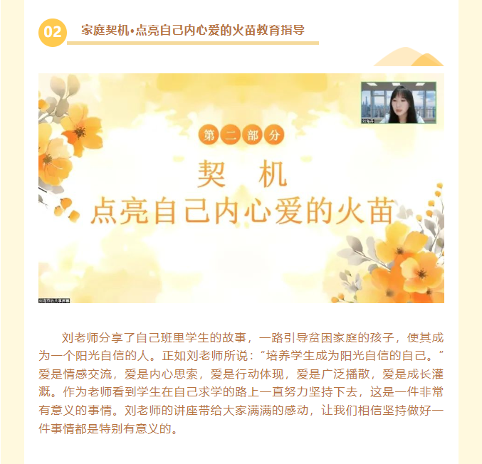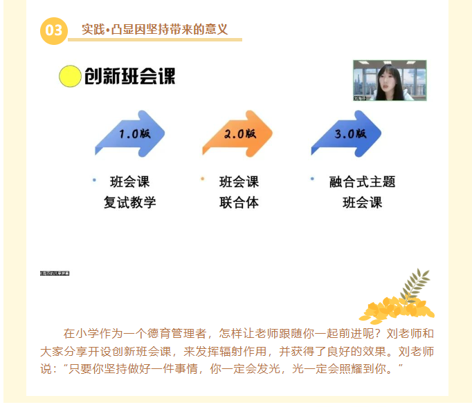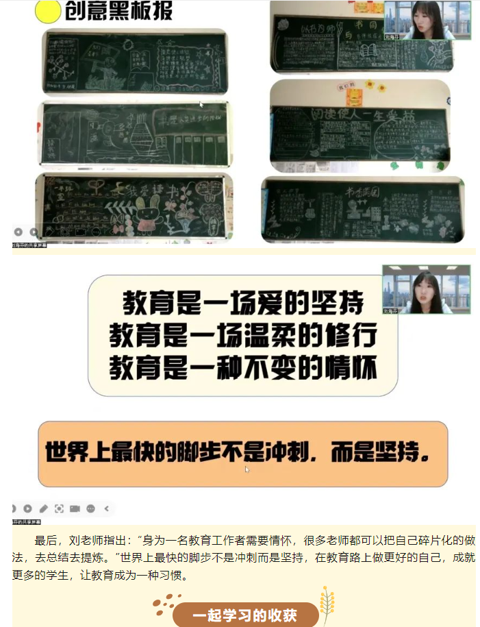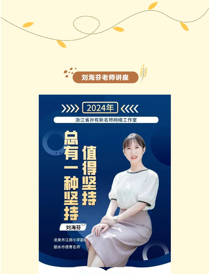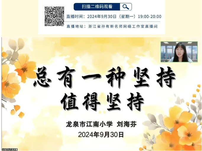 2024年9月30日晚19:00,温州市杨邦造高中名班主任工作室的成员们齐聚云端,通过浙江省孙有新名师网络工作室直播间,参与了一场以《总有一种坚持,值得坚持》为主题的精彩讲座。本次讲座由浙江省孙有新名师网络工作室学科带头人,龙泉市江南小学副校长,高级教师,丽水市德育名师刘海芬老师主讲,她回顾自己工作经历中一个个故事,从坚持关爱学生到坚持上班会课,坚持引领老师的成长。