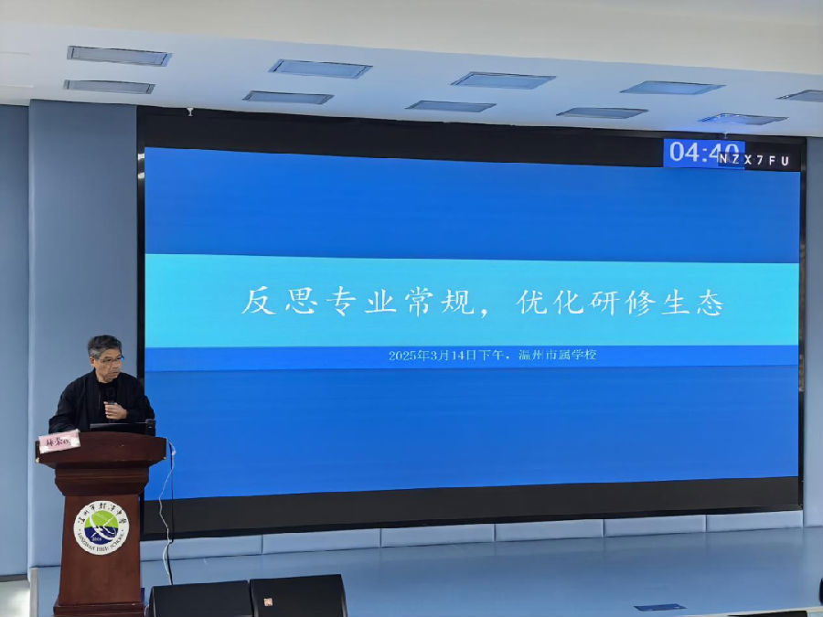 论证环节结束后,林荣凑老师以《反思专业常规,优化研修生态》为题开展讲座和指导。针对每所学校的方案提出精准建议和研修方向的优化。例如,对温州市第二职业中等专业学校的校本研修方案,林老师指出“以“融合教学”为核心理念,强调文化课与专业课等的融合,让教师不再隔膜。基于学部的合作,可以再增加学科的融合;对温州市中等幼儿师范学校,林老师建议加上课程的开发、实施、评价等实际的课程能力着力。林老师的指导既直击痛点,又提供可操作的改进方向,与会校本研修负责人及教研组长纷纷表示深受启发。