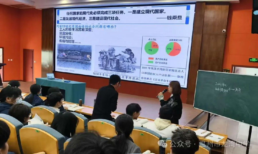 龙湾中学张静老师执教的《工业化时代英国的社会治理变化》,以19世纪英国社会问题为切口,构建"史料实证—时空定位—观点辩论"的三阶思维阶梯。课堂通过工人阶级抗争、资产阶级改革、思想家理论构建三条叙事脉络,生动演绎社会治理的现代化转型,特别注重引导学生从历史镜鉴中提炼对中国式现代化的启示。