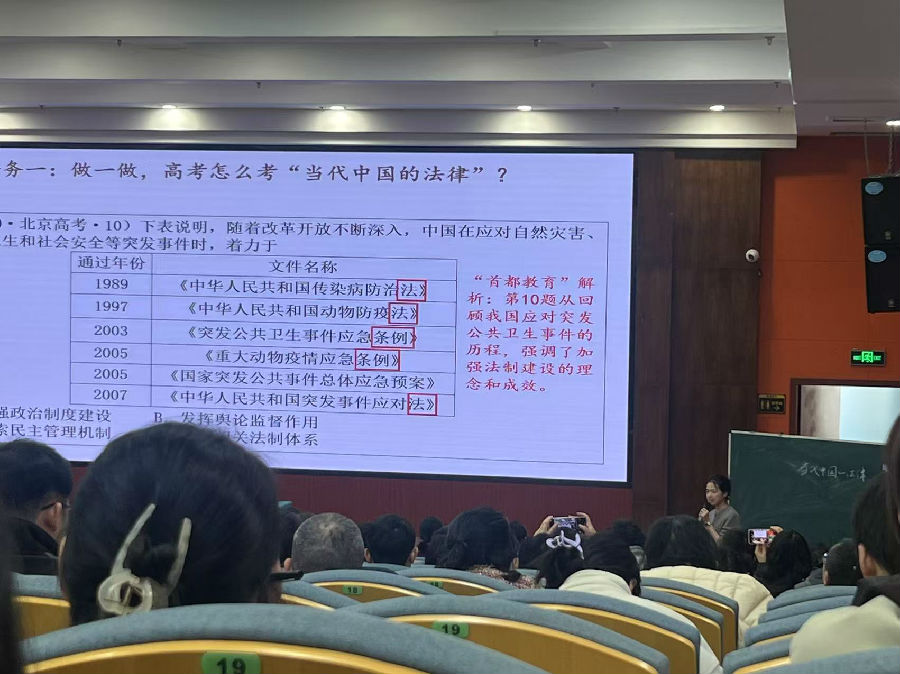 温州中学杨文密老师则在《当代中国的法律》一课中创新采用"五步进阶法":从真题回溯到知识结构化整理,从制度变迁分析到现实情境推演,最终达成历史认识的升华。课堂通过"情境—问题"双线驱动,将《民法典》等现实案例融入教学,使法治精神培养与家国情怀培育相得益彰。