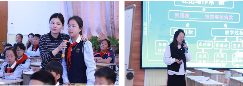 张靖老师和张志萍老师执教高段课例《我预测 很快要被淘汰》。张靖老师引导学生从不同角度合理地预测内容,帮助学生打开思路。陈婷婷老师结合课例阐述了如何让学生会想、会说、会写。