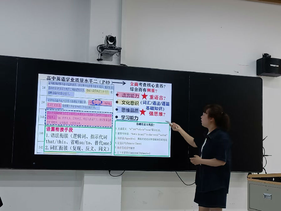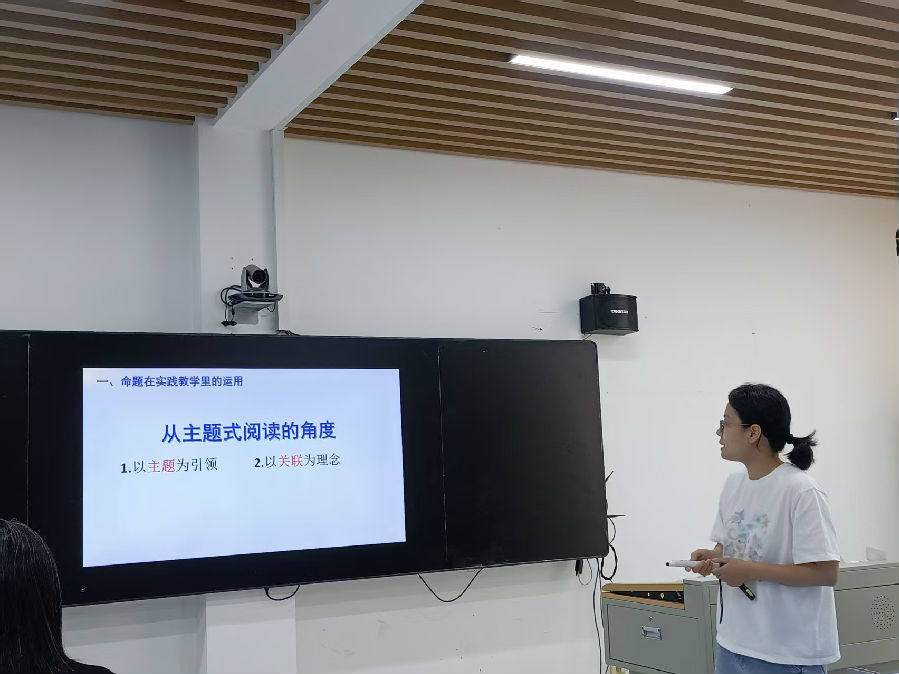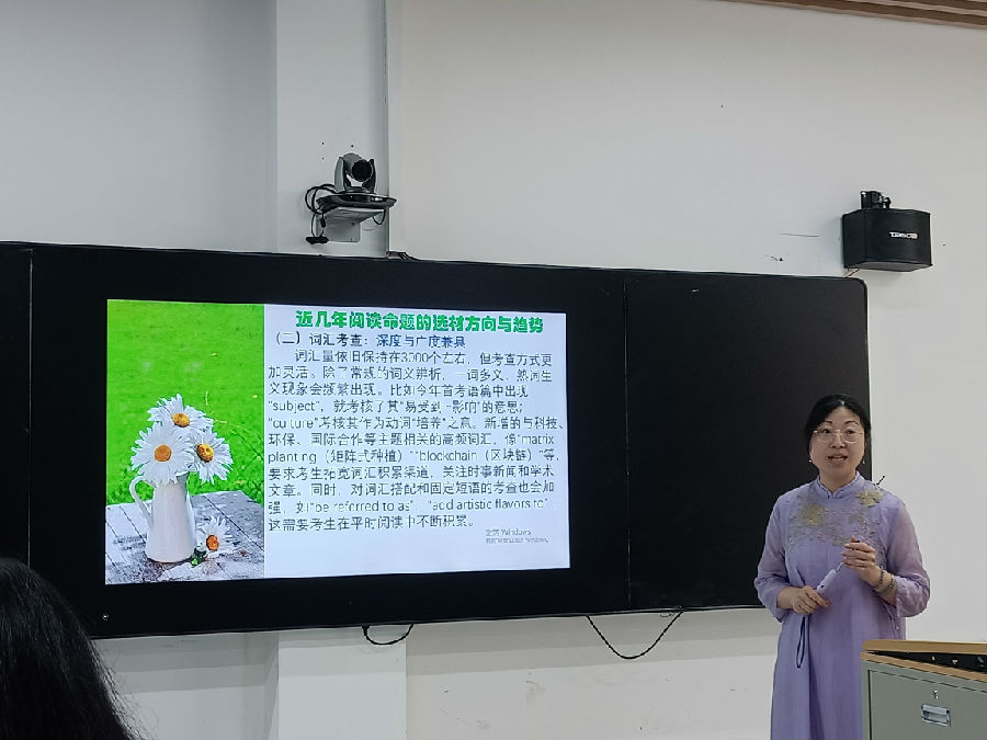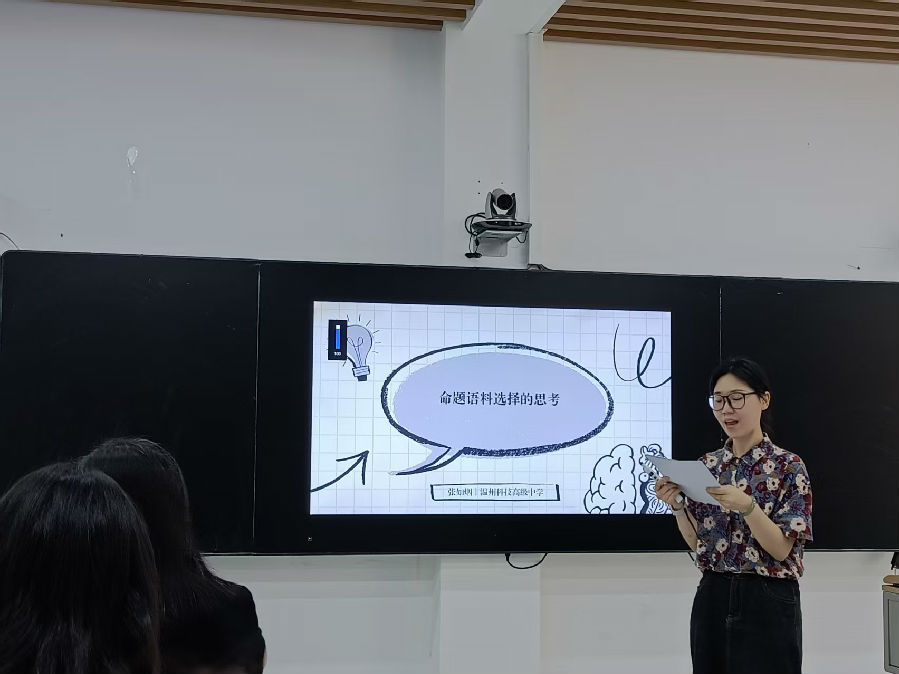 接着,国科温州附属高级中学张红叶老师和乐清中学赵海霞老师做了两场专业的测试命题讲座—《论文本的选择及改编》与《关于设题的几点思考。张老师主要从近年来全国卷CD篇阅读的取材入手,以25年1月八省联考为例,串联回顾了23年至25年高考真题的取材特点,引导大家关注CD篇语料的反认知特性及其文本的基本架构。然后结合24年温州市三模CD篇的命题流程操作,和大家一起探索如何从发现适合高考命题的语料到打磨成适合学生高考阅训练的文本的过程。张老师还和大家共同讨论了阅读语篇中日益频繁的一词多义现象,并分享了自己日常教学中拓展学生这方面能力的具体做法。赵海霞老师 以“关于高考阅读理解设题的几点思考”为主题,从科学性原则、规范性原则和区分度原则三方面展开探讨。科学性原则强调紧扣文本逻辑、避免剧透且正确转述答案;规范性原则要求题目简洁明了、选项语法一致且使用标准化语言与结构;区分度原则着重梯度难度设置,涵盖词汇和逻辑复杂度区分。赵老师通过具体的典型错误例子和高考真题的对比让老师们体会这几点原则。此外,还指出平时的命题设计应依据考纲词汇,结合学生典型错误,以实现精准有效的考核。如果参加命题比赛,要遵循“人无我有,人有我优, 人优我特,人特我精!”