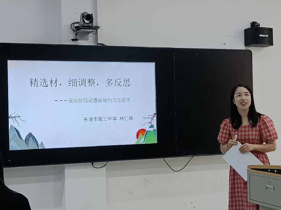 乐清三中林仁微老师以《读后续写试题命制的思考---以2025首考为例》为题,提出要从“精选材,细调整,多反思”三个维度来展开。以2025.1首考续写真题为例,提出续写命制语篇选择要精选且具“立德树人”“五育并举”的育人导向;在试题命制时,首先,可利用拉波夫叙事结构分析原始素材,先确定续写故事的读写黄金分割点。其次,她认为要厘清主题线,使文本逻辑框架清晰化,便于学生续写模仿。在改编过程中避免支线干扰,以“单一事件+主角行动”来推进情节。在改编手法上,可结合“大改和小改”文本,去繁化简,助学生厘清情节和续写思路。在语用上,可利用主述位隐形逻辑骨架改编过程以及借助细节描述,来推进描述紧凑感,以此便于学生模仿和引导续写故事的走向。在任务设置环节,她提出遵循单一主线原则,结合原来故事走向、依托前文铺垫、利用前文的矛盾冲突设置两句段首句,并对语言和字数提出要求。她认为读写试题的命制要对课堂教学有导向作用。整场讲座逻辑清晰,利用理论框架和案例佐证,对读后续写命制有一定的深入思考,并对指导高中英语读后续写的课堂教学很有启发。