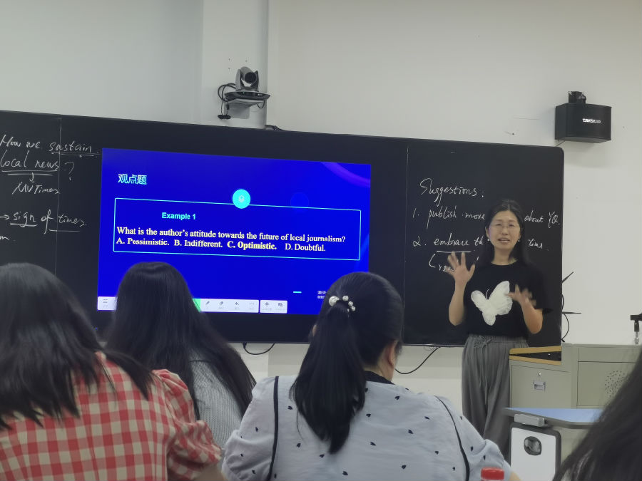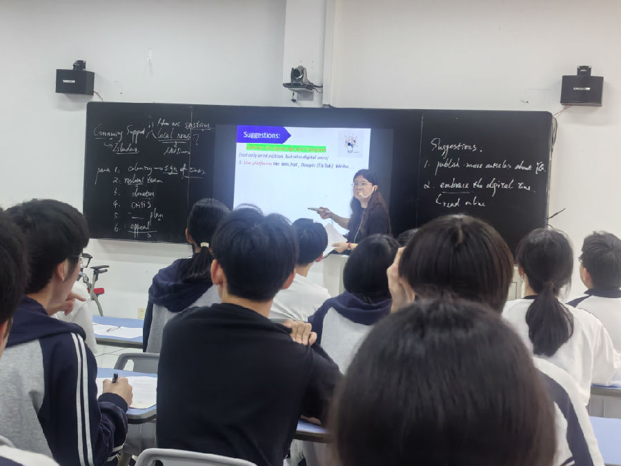 下午的活动以教学和专题讲座为主。首先,乐清中学陈路平老师带来了一堂充满深度思考的精彩课堂。陈老师巧妙地以“五一”乐清非遗巡游活动以及《乐清日报》纸媒的现状为切入点,成功地吸引了学生的注意力,并导入了当天的课堂话题。在课堂上,陈老师引导学生通过提炼topic word(s)来梳理各段落的主旨大意,为深入理解文本奠定了坚实的基础。随后,陈老师带领学生细读各段,以“appeal for donation”(募捐呼吁)为主线,精心挖掘散落在各段落中的相关信息,使学生能够逐步深入地理解文本内容。课堂的高潮部分,陈老师鼓励学生们进行头脑风暴,共同探讨帮助《乐清日报》走出困境的建议。整堂课教学流程一气呵成,师生之间的互动精彩纷呈,课堂氛围活跃,思维的火花不断碰撞。