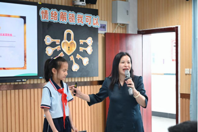 小学部第三节,浙江省孙有新名师网络工作室学科带头人、丽水市德育名师练芬玲老师与四年(1)班开展了一场《解锁情绪,我可以》的探索之旅。通过课前约定,在拼拼乐游戏中初识情绪;从调查情绪级别和来源中,指出消极情绪犹如一把心锁,要去寻找打开的钥匙,激发课堂兴趣;接着,从聆听小故事和观看图片中找到了“换个角度”“合理宣泄”两把金钥匙;通过对来自学生的典型事件讨论,引导小组合作,寻找金钥匙解决个人情绪小问题;通过挤眉弄眼吃饼干等体验活动,感受五官参与的情绪释放。通过体验、讨论、感悟,享受自我成长过程。最后,为孩子们提供心理求助方式,在自我接纳的小诗中打开心锁。本节心理健康团辅课,帮助孩子们更好地认识和理解情绪,在寻找金钥匙的过程中提升心理健康水平和自我调节能力,在轻松的课堂中获得“心”的成长。
