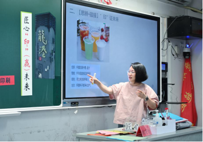 初中部第一节,浙江省孙有新名师网络工作室学科带头人、温州市优秀教师韩晓珍老师在八(2)班开展《匠心“印”(赢)未来》乡土教育主题班会。以“印藏乾坤”方言挑战赛为切入点,引领学生探寻龙港印刷文化根脉。在“印证未来”环节,通过研读印刷包装产业标准化白皮书,围绕“印刷业是夕阳还是朝阳”展开讨论,让学生认识到:唯有创新求变,传统产业才能焕发新生。最具创意的是“印领时代”设计环节,学生通过智慧碰撞,匠心独运地呈现了防潮薯片袋、可视化可乐罐等创新方案,充分地展现了卓越的包装设计潜能。最后,“印心同行”环节以“时光宝盒”为载体,将当下创意与未来期许巧妙联结。这节班会以创新设计巧妙融合项目式学习,构建“知乡情-明现状-创未来-立壮志”的育人闭环,既深化学生对乡土文化的认同,又培育新时代下所需的匠心品质和创新精神。