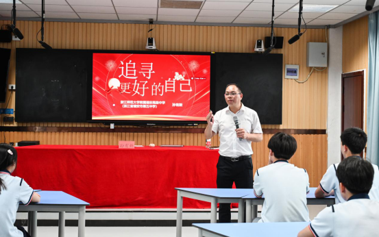 同时,浙江省孙有新名师网络工作室主持人、德育正高级教师孙有新老师为九年级学生带来中考励志演讲《追寻更好的自己》。开场,孙老师以“鼓掌+点赞” 互动游戏调动气氛,让学生学会表达欣赏与自信。演讲中,孙老师结合邓紫棋、周迅等明星的励志故事及自身成长经历,以“相信的力量”唤醒学生心底的勇气,借“坚持的力量”驱散备考路上的迷茫,用“悦纳的力量”引导学生正视不足、拥抱成长,凭“梦想的力量”点亮学子们的奋斗征程,为即将奔赴中考战场的学生们注入强大精神动力。在“我们见证”环节,同学们踊跃上台喊出中考目标,将气氛推向高潮。最后,演讲在激昂的中考誓词声中落幕。这场演讲如明灯照亮学子前行路,激励他们冲刺中考,追寻更好的自己。