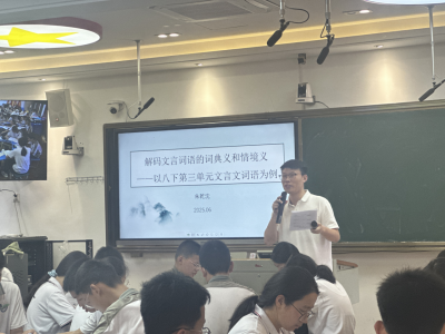 第二节课由温州市南浦实验中学朱乾沈老师执教《文言实词积累与迁移——从课内到课外》。朱老师的设计由浅入深,引导学生在篇篇联合、课内课外整合中形成高阶思维。