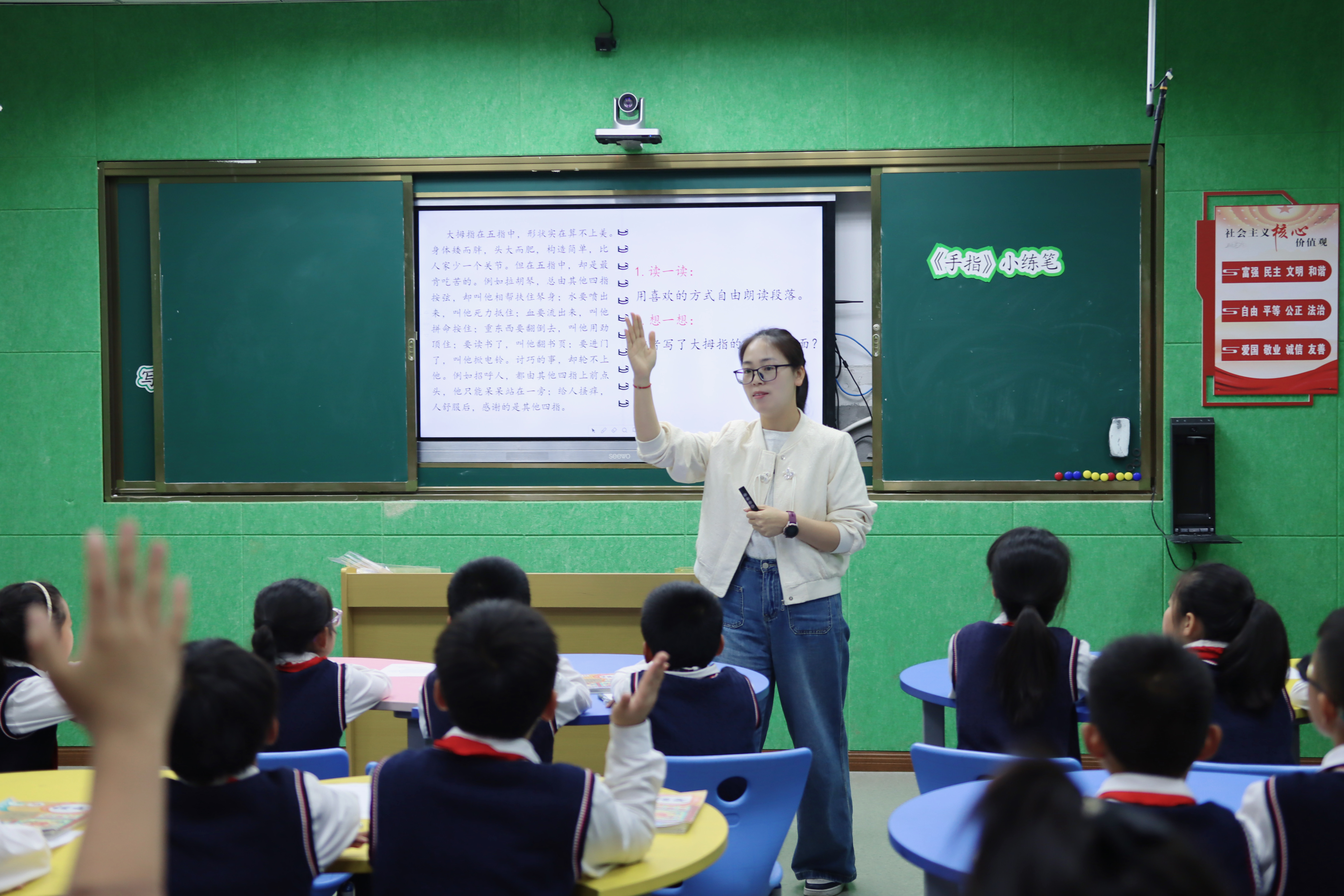 下午第一节由赵晓芬老师执教《手指》小练笔。整堂课,赵老师紧紧围绕着“写什么”和“怎么写”两方面进行教学,板块清晰,教学设计环环相扣。在教学过程中,赵老师以大拇指片段为例,带着学生梳理习作秘诀,借助思维导图、放大镜等工具,让学生分三次练笔,从短句到片段,从平淡到风趣,层层递进,让学生习得练笔方法,落地生花。