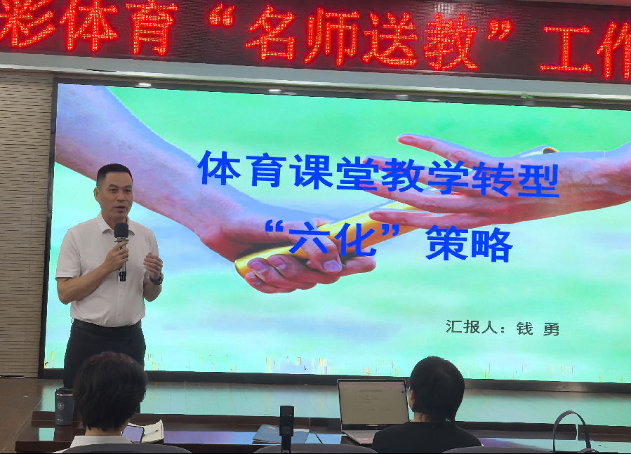 9月20日上午,温州市教师教育院的钱勇老师为工作室的小伙伴带来了一场以聚焦体育课堂教学转型的专题讲座,提出以“六化”策略推动体育教育从传统模式向核心素养导向迈进。讲座围绕六大转型方向,为新时代体育教学提供了理论与实践并重的创新路径。教学重点由单一知识技能传授转向学生综合能力的培养,强调在真实运动场景中实现体能、认知与协作的融合发展。突破传统技能拆分教学,以完整“运动结构”为核心,帮助学生建立系统性运动认知,提升学习连贯性与应用性。通过设计贴近实战的复杂运动情境,激发学生探究兴趣,培养其在多变环境中灵活运用技能的能力。以关键问题替代指令式教学,引导学生主动发现、分析与解决运动中的问题,推动自主探究与深度思考。超越形式化分组,强调小组协同中的角色分工、资源整合与集体决策,实现真正意义上的合作学习。构建贯穿学习过程的多维评价体系,关注个体进步与成长轨迹,实现从结果评判到过程促进的转变。