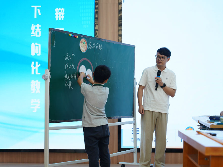 下午的第一节课由温州大学附属茶山实验小学的林轩逸老师执教《烙饼问题》。这节课将经典的数学优化问题转化为一场生动的思维体操,林教师引导学生从“一张饼”、“两张饼”“四张饼”的简单情况入手,通过猜想、验证、辩论、优化,逐步探寻“烙三张饼”的最优策略。课堂上,学生之间观点碰撞,“为什么这样烙时间最短?”“他的方案哪里可以改进?”等质疑与反驳此起彼伏,在真实的思辨过程中,学生的审辩思维和解决问题的能力得到了淋漓尽致的锻炼。