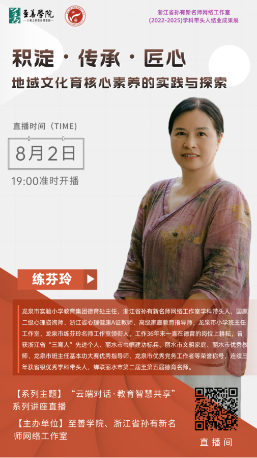 2025年8月2日晚,2023 级温州市孙有新“名师送教”工作室第 29 次研修活动在线上顺利开展。工作室成员共同聆听了浙江省孙有新名师网络工作室学科带头人、丽水市德育名师练芬玲老师的专题讲座《积淀・传承・匠心——地域文化育核心素养的实践与探索》。练老师深耕16年的地域文化与核心素养培育融合实践,为新时代德育工作创新提供了可借鉴的鲜活样本,也为工作室成员拓宽了德育思路。