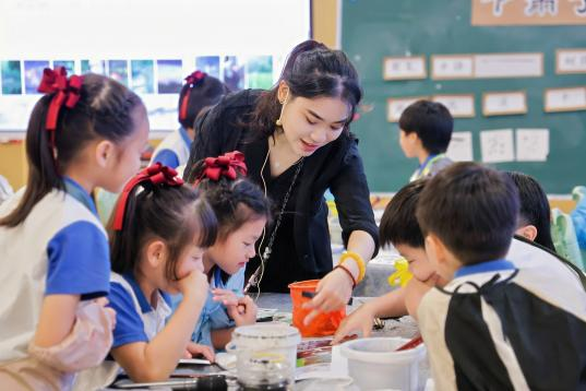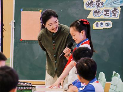 温州市建设小学七都分校的王昱人老师带来的《下雨了》,则是一堂“学评一致”的趣味水墨课。王老师采用“先试后导”的教学策略,鼓励学生大胆尝试,从自主探索中发现问题,再通过名作借鉴重构经验,巧妙突破技法难点。课堂还将甲骨文“雨”字与水墨游戏融合,引导学生在笔墨挥洒中完成半抽象创作,不仅提升了学生的造型表现能力,更在游戏中激发了他们对传统文化的热爱。