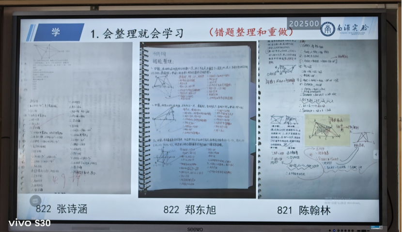 童老师认为,每一位老师应该要注重板书的书写,从板书排版体现老师备课的过程,体现老师对课程的理解,是教学过程中非常重要的一环。在教育教学中提倡学生准备活页本,进行错题的整理和重做,老师通过错题变式进行一周一次的检验,攻破重点难点。班级里安排一周或者二周做一次知识点的整理,再次让学生对知识点进一步进行巩固,打下扎实的基础。关注家校沟通,利用钉钉进行家校联系和对个别问题的解答。