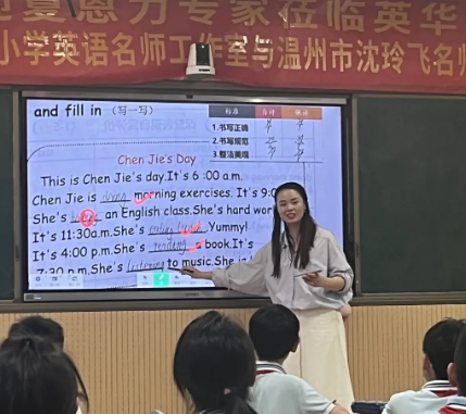 平阳县萧江镇实验小学的黄丽萍老师带来了PEP6 Unit6 Part A Let’s learn的课例展示,她带领五年级的孩子们,通过层层递进的活动设计,让新旧知识不断循环滚动,在听、说、读、写、演的活动中让学生感知单词的音、形、义。由Chen Jie’s daily vlog到观察其他人vlog片段,再到思考“How to make a daily vlog”,最后到Make a daily vlog的成果展示,使学生在活动中进一步内化语言。