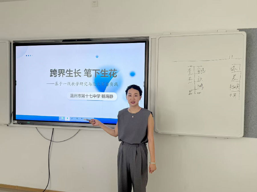 讲座结束后,经验交流环节接续开展。温州市第十七中学杨海静老师以 跨界生长 笔下生花为主题,分享了一线教学研究与论文写作的实践心得。她结合日常教学中的真实困惑,讲述了如何从课堂细节中挖掘论文选题,如何通过跨学科视角丰富研究维度,为学员提供了 从实践到文字的实用技巧。