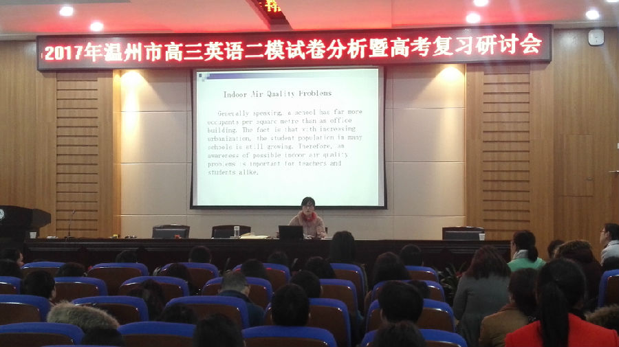 316日,温州八高崇德楼罗山厅里,人头攒动,盛况空前——2017年温州市高三英语高考复习研讨会暨郑秋秋名师工作室第三次研修活动在这里隆重举行。来自温州市各县市区300多名高三英语老师代表积极参加了此次活动,不仅过道坐满了与会老师,就连报考厅门口也站满了认真听课的老师。