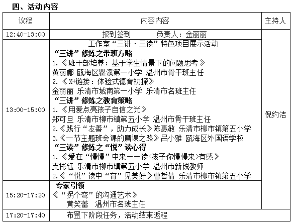 为了贯彻《教育部关于进一步加强中小学班主任工作的意见》文件精神,为发挥名师的示范辐射作用,加快班主任队伍建设,提高班主任专业素养决定举行第三期温州市黄笑蕾名班主任工作室23次集训“三读·三讲·三课”项目研修成果展示活动瓯海第六小学教育集团班主任研修之瓯外半塘视野展示活动现将有关事项通知如下: