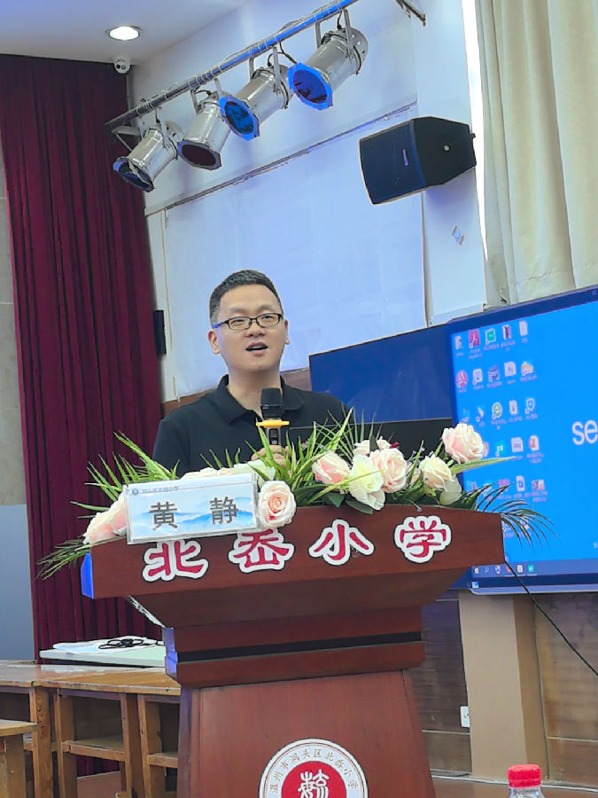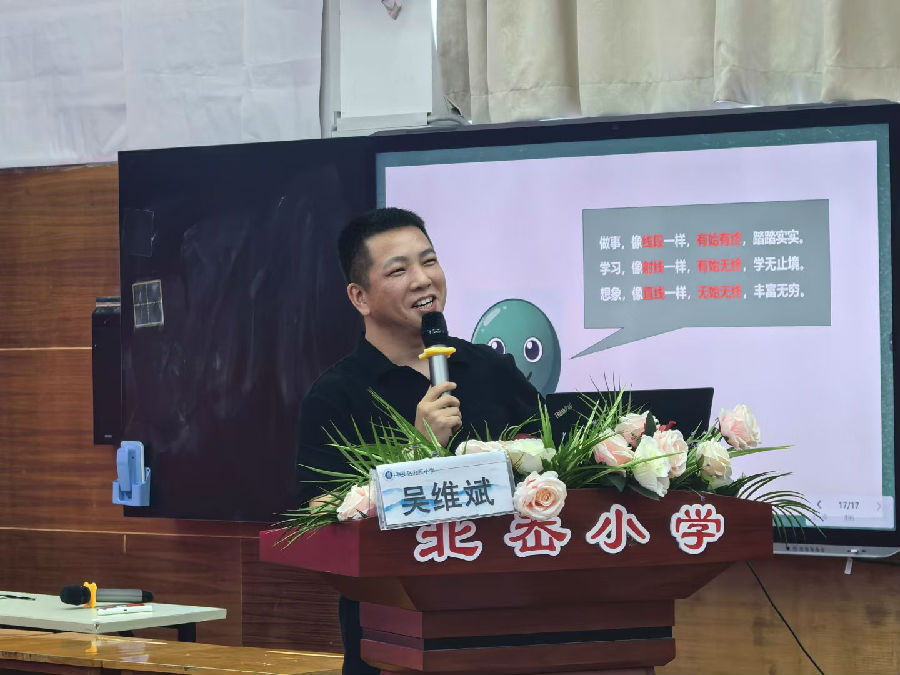 紧接着,工作室学科带头人依次登台,结合自身教学实践分享教学主张。吴维斌老师以“学作融合:素养导向下的小学数学单元作业设计”为主题,聚焦学生实际需求,将“学”与“作”深度融合,通过单元作业设计案例,展示如何让作业成为巩固知识、发展能力的载体,为在场教师提供了可复制的作业设计范式。